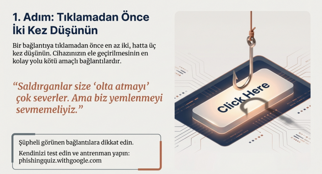 Çok klişe olacak ama hatırlatmakta fayda var. Bir bağlantıya tıklamadan önce en az iki kez düşünmekte fayda var. Hatta üç. Cihazınızın ve internet profillerinizin ele geçirilmesinin en kolay yollarından biri kötü amaçlı bağlantılara tıklamak. Saldırganlar size ‘olta atmayı’ çok severler. Ama biz yemlenmeyi sevmemeliyiz. Şüpheli gördüğünüz bağlantılara dikkat etmemiz gerekiyor. Bu konuda antreman yapabileceğiniz harika bir site var: phishingquiz.withgoogle.com