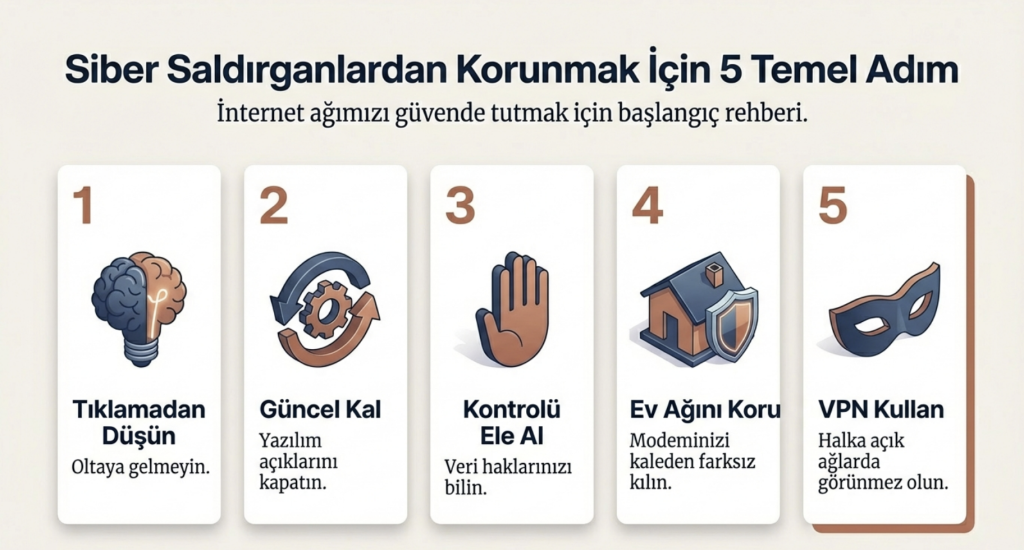 Madem bugün “Güvenli İnternet Günü” ben de okuyucularımızın başını çok ağrıtmadan, siber saldırganlardan ve zorbalardan korunmak için atacağız temel adımları sizinle paylaşmak istedim. Elbette aşağıda yazdıklarımı yaptığınızda tamamen güvende olmayacaksınız, ama bu adımlar internet kullanırken kaygılanan hepimiz için neler yapmamız gerektiğine dair güzel bir başlangıç olabilir.