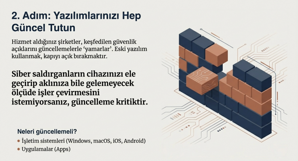 Tüm elektronik cihazlarınızda işletim sistemlerinin ve uygulamaların son sürümlerini kullandığınıza dikkat edin ve yazılımlarınızı hep güncelleyin. Hizmetini aldığınız şirket ya da topluluk keşfedilen açıkları güncellemelerle yamıyorlar. Kullandığınız yazılımın eski olmasından dolayı, siber saldırganların cihazınızı ele geçirip aklınıza bile gelemeyecek ölçüde işler çevirmesini istemiyorsanız, güncelleme kritik.