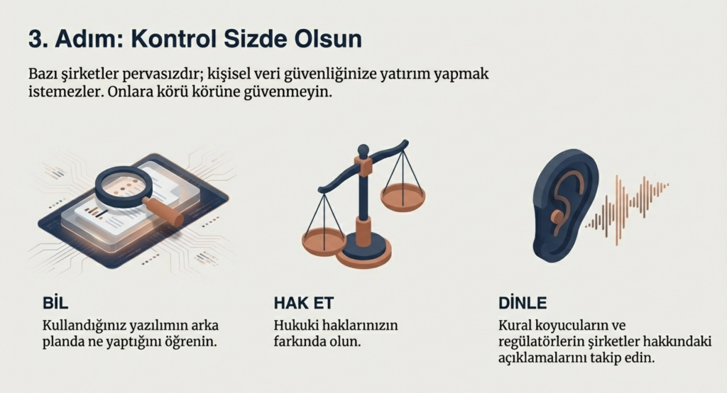 Bazı şirketler çok pervasız ve onlara güvenmemek gerekiyor. Çoğu kişisel verilerimizin güvenliğini önemsemiyor. Yatırımlarını buraya ayırmak istemiyorlar. Bu yüzden kullandığınız yazılımların ne yaptığını mutlaka bilin, hukuki haklarınızı da bilin. Dünyadaki hem satış süreçlerinde hem de yazılımlar hakkında kural koyucuların açıklamalarını ve görüşlerini mutlaka dinleyin.