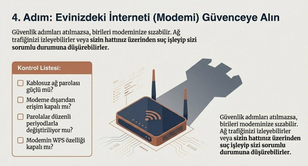 Evinizdeki modemi mutlaka güvenceye alın. Kablosuz ağ parolanız güvenli mi? Modeminize dışardan erişilebiliniyor mu? Parolalarınızı düzenli periyodlarla değiştiriyor musunuz? Modeminizin WPS’i açık mı? Bunlar çok önemli. Buradaki soruların cevaplarına yönelik güvenlik adımları gerçekleştirmezseniz, birileri sizin modeminize sızarak, sizin modeminiz üzerinden korkunç suçlar işleyebilir, ağ trafiğinizi izleyebilir ve tüm bunların sorumlusu olup hapse bile düşebilirsiniz.