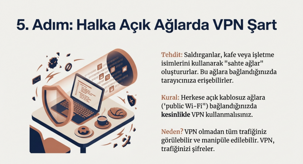 Siber saldırganlar genelde gayet sıradan isimlerle, bulunduğunuz ortamdaki işletmelerin ya da binaların isimlerini kullanarak sahte kablosuz ağlar oluşturmaktadır. Böylece kolayca bu sahte ağlarla tarayıcınıza ve bilgisayarınıza erişebiliyorlar. Herkese açık kablosuz ağlara bağlandığınızda (“public Wi-Fi”) kesinlikle internet trafiğinizi şifreleyen VPN hizmetleri kullanmalısınız. Yoksa girdiğiniz ağdaki tüm tarayıcı ve bilgisayar faaliyetiniz görülebilir ve manipüle edilebilir.
